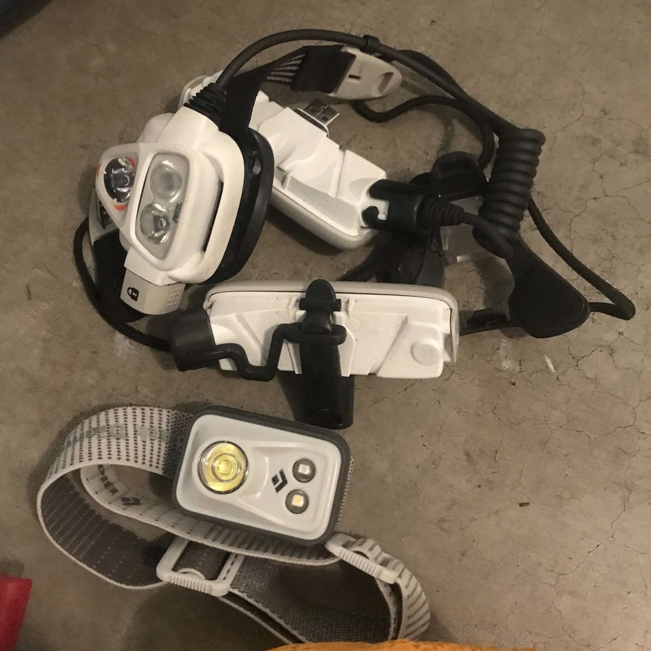 I used the Black Diamond Cosmo (bottom, 160 lumens) for the first summit, then Petzl Nao (top, 575 Lumens) for eveything else.