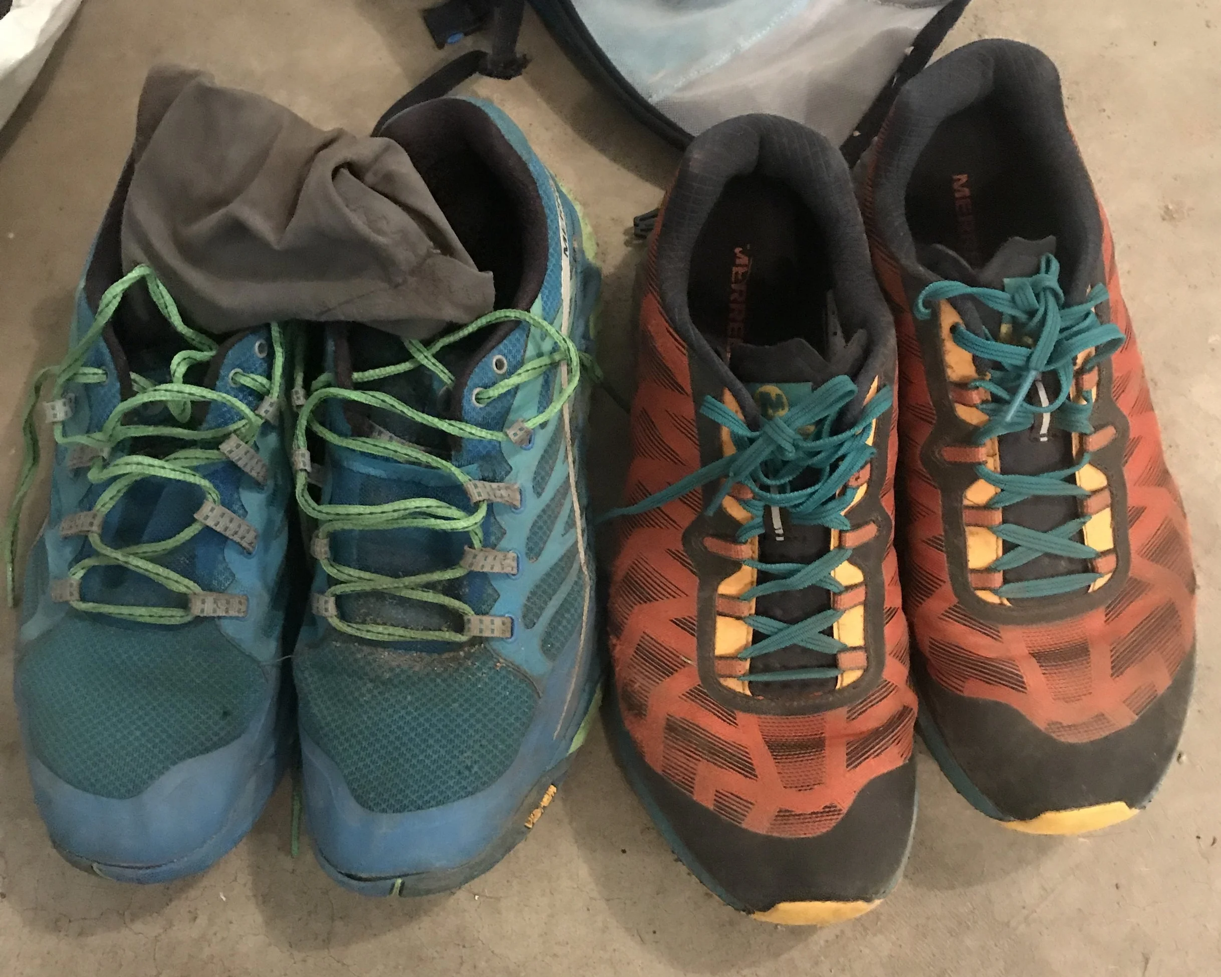 Merrell All Out Peak & Gaiters (Left) I used for 67 Miles, Agility Synthesis Flex (Right) worn for the first 30 miles.