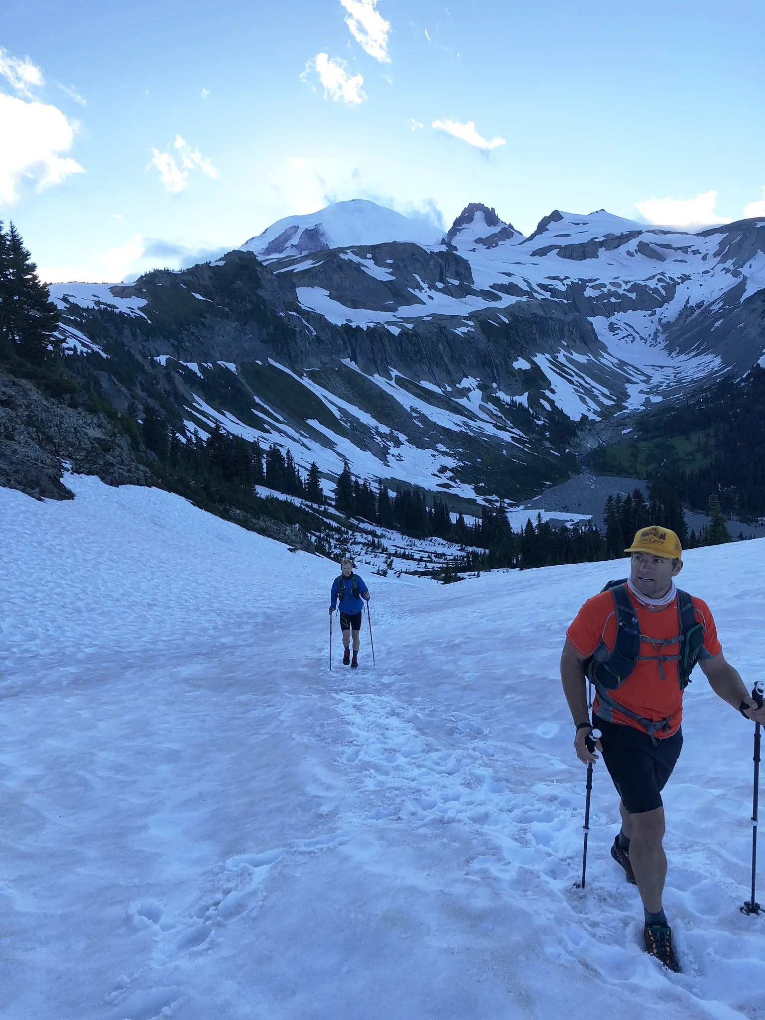 For the first lap up Mt. Rainier, I elected to wear lighter mountaineering boots (Trango Cube GTX) and carry a pair of light trail runners (Merrell All Out Crush 2) for the trail run out from Glacier Basin. I was happy with my decision and appreciated the rigid boot in the soft snow as we descended the Emmons glacier. Erik and Scott Bennett both wore a gaitored hybrid trail runner, but I don’t think that configuration would have sped up our times or made the climb more comfortable. I greatly valued the ability to change into comfortable trail runners and was glad I carried them up and over Rainier each time.